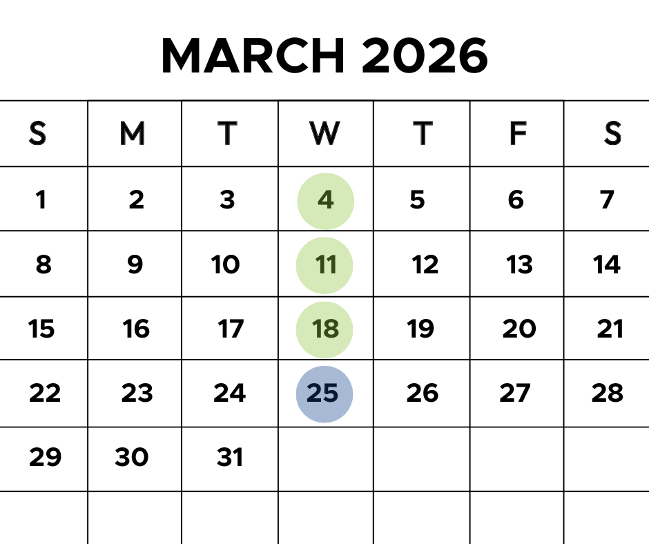 All events are from 6:30 – 8:00 pm at First Baptist